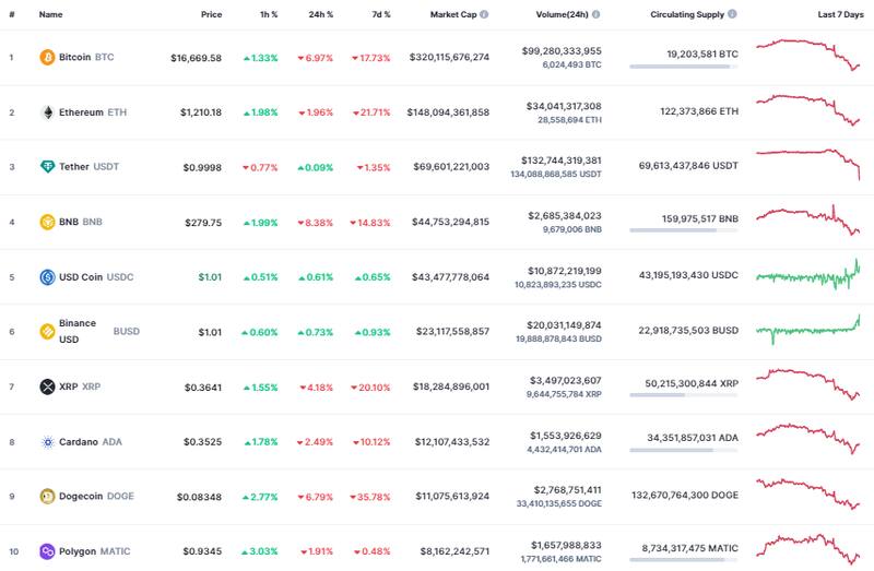 Según la información de CoinMarketCap, la cotización de BTC bajó un 7% para mantener el precio levemente por debajo de losu$s 16.600. Por su parte, Ethereum (ETH) tuvo un rendimiento similar al registrar una caída del 2% en las últimas 24 horas que deja su precio justo en los u$s 1210.