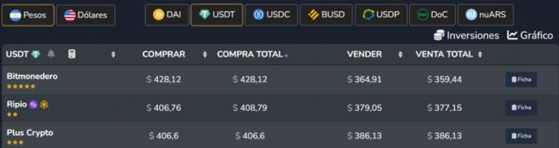 Según revela la plataforma, la moneda estable USDT actualmente se negocia a $ 428,46 en el exchange Bitmonedero. Este precio supone una diferencia de $ 46,46 con el del dólar paralelo.