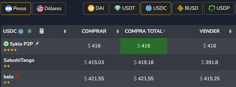 Acorde a los datos del sitio Criptoya, que revela las cotizaciones de las monedas estables en diferentes plataformas, el dólar digital USDC puede encontrarse a un precio de $ 416 mediante el sistema P2P del exchange Syklo.