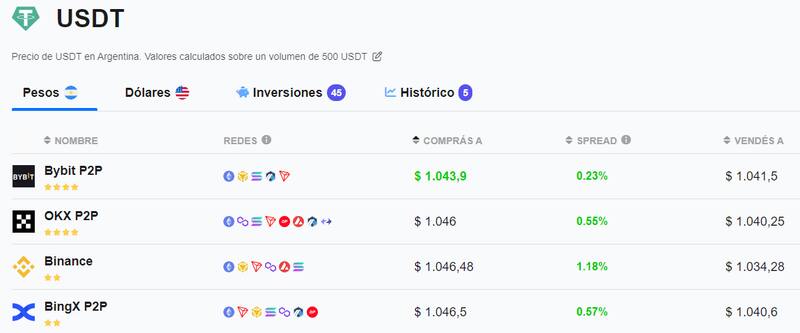 USDT, la moneda estable más famosa del mercado, puede encontrarse a $ 1.043 a través del sistema peer to peer (P2P) del exchange Bybit, mientras que en Binance se ofrece a $ 1.046.