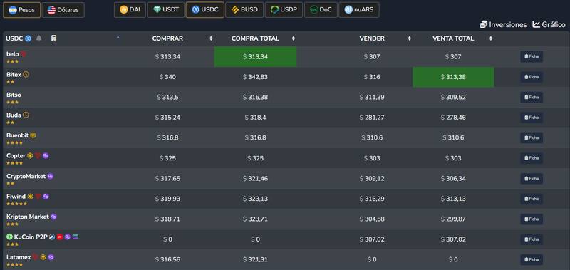 Tanto en las operaciones de par a par (o P2P) como en las operaciones oficiales a través de un exchange, el dólar digital USDT cotiza en torno a los $ 310-$315, estando su valor más bajo incluso por debajo de los $310. Otro dólar digital, el USDC, en cambio, cotiza más caro: su precio más amigable es $ 313 mientras que algunas empresas lo están ofreciendo por arriba de los $ 320.