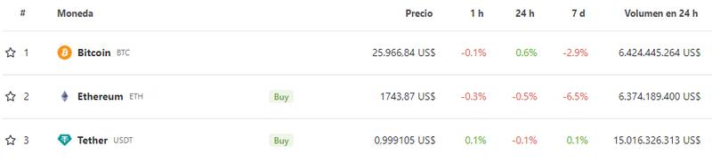 Ahora, la criptomoneda más popular del mercado opera a u$s 25.966,84, lo que supone un aumento del 0,6% en 24 horas. En cuanto a los últimos 7 días, sin embargo, el token estrella acumula una baja del 2,9%.