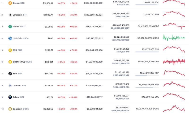 Según la información de CoinMarketCap, la cotización de BTC bajó un 4,5% para dejar su precio en el rango de los u$s 19.000. Ethereum (ETH) tuvo un rendimiento aun peor al registrar una baja del 8,2% en las últimas 24 horas que dejó al activo con una cotización casi al límite de los u$s 1000.