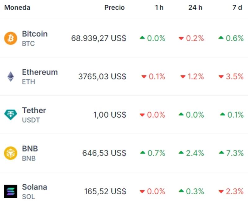 Bitcoin (BTC) tuvo una baja de 0,2% en las últimas 24 horas, por lo que pasó a cotizar alrededor de los u$s 68.939.