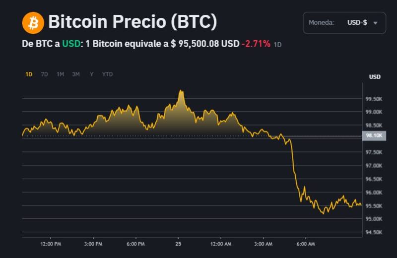 Con una caída cercana al 7% en la última semana, Bitcoin (BTC) aún se mantiene alejado de la zona de los u$s 100.000. Por lo tanto, el activo digital se posiciona en torno a u$s 95.500.