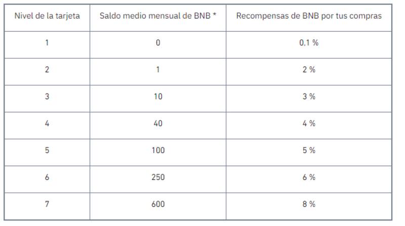 Esto significa que el nivel de cuenta varía diariamente dependiendo de la cantidad de criptomonedas depositadas, con el mínimo necesario puesto en 1 BNB (aproximadamente $ 31.000 para aplicar a un 2% de cashback) y el máximo establecido en 600 BNB (aproximadamente $ 19 millones por un 8% de cashback).