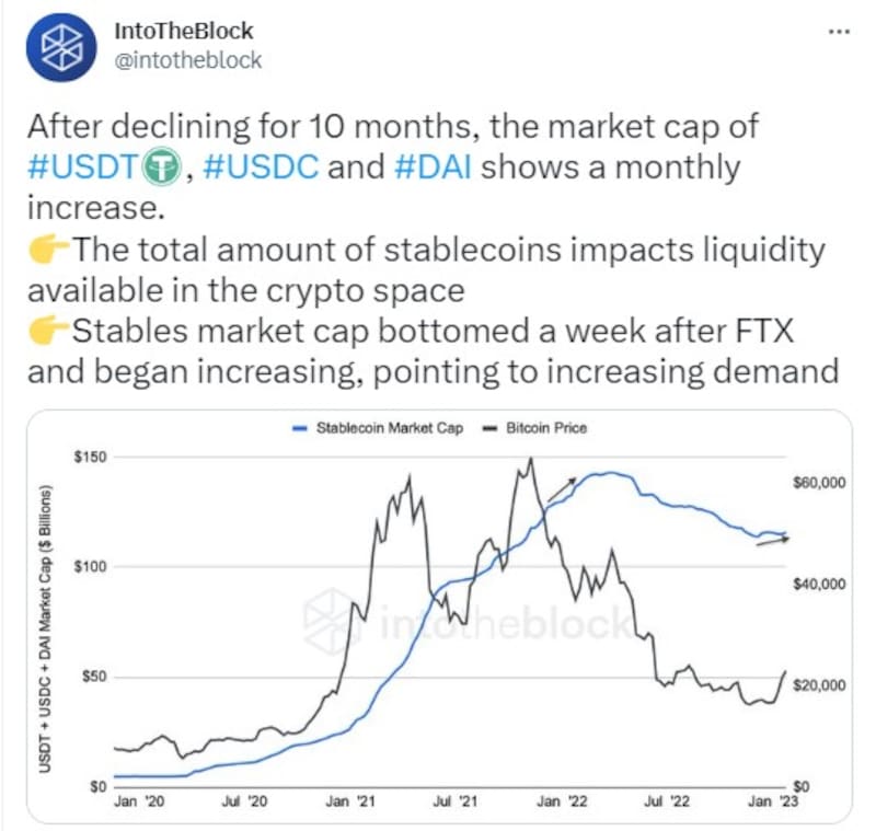 "Después de disminuir durante 10 meses, la capitalización de mercado de #USD, #USDC y #DAI muestra un aumento mensual", escribió el sitio previamente mencionado en su cuenta de Twitter.