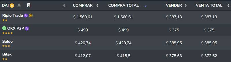 Si nos movemos de OKX, se puede ver la misma moneda a un precio de $ 420,68 en la criptoempresa Saldo, por ejemplo. En Bitex, en cambio, los valores son más amigables y se puede comprar DAI a $ 415.