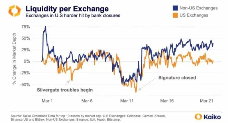 Una de las consecuencias de la falta de liquidez es una mayor volatilidad de precios en los exchanges estadounidenses, donde las diferencias de precio en criptomonedas como BTC y USDT aumentó fuertemente en comparación con otros exchanges fuera de Estados Unidos. Por ejemplo, el precio de BTC en Binance.US es más volátil que el precio medio de otros 10 exchanges.
