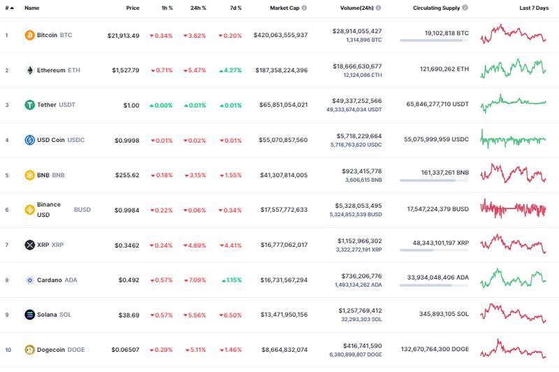 Según la información de CoinMarketCap, la cotización de BTC cayó un 3,6% para dejar su precio en el rango de los u$s 21.900. Ethereum (ETH) tuvo un peor rendimiento con una baja del 5,4% en las últimas 24 horas que dejó al activo con una cotización al borde de los u$s 1500.