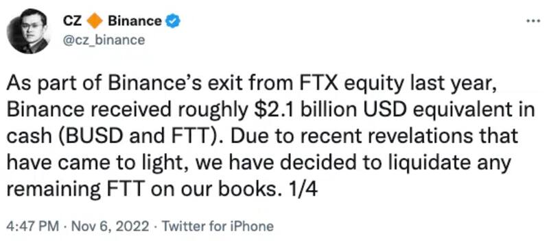 Binance confirmó que liquidaría todas sus posiciones de FTX basados en "las recientes revelaciones que han salido a la luz" como citó el CEO de Binance, Changpeng Zhao (CZ), en un tuit confirmando que Binance venderá "cualquier FTT restante en nuestros registros".