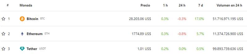 Concretamente, la moneda más importante del mercado (por capitalización) se negocia a u$s 28.203,06, lo que supone un leve tropiezo del 0,3% en las últimas horas. De todas formas, el activo acumula una suba del 17% en 7 días.