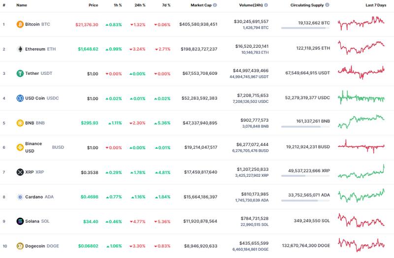 Según la información de CoinMarketCap, la cotización de BTC bajó un 1,3% durante el último día para dejar su precio en el rango de los u$s 21.300. Por su parte, Ethereum (ETH) cayó un 3,2% en las últimas 24 horas para dejar su precio al borde de los u$s 1600.