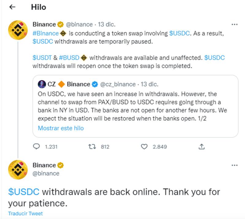 El "corralito" es sobre los retiros, aunque no lo ingresos por lo que el movimiento de activos sobre USDC sigue fluyendo. El CEO de Binance apunta que el bloqueo es algo puntual, será limitado en el dinero y es una medida normal. Pero lo cierto es que no es habitual verlo, como tampoco es que el 25% de las reservas de USDC desaparezcan en unos pocos días.