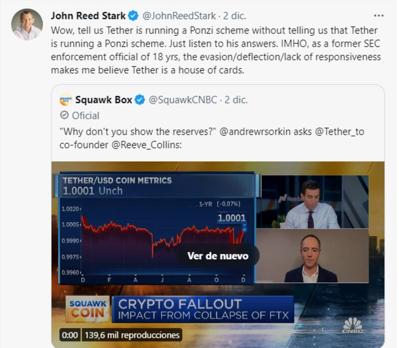 Reed respondió fuertemente a las declaraciones de Tether en una entrevista con CNBC, donde hablo el cofundador de la empresa, Reeve Collins. Se criticó la escasa información que compartían sobre las reservas de la stablecoin, en especial tras la caída del exchange FTX. Acá, el ex funcionario de la SEC criticó la opacidad por parte de los operadores de la criptomoneda, citando la falta de transparencia con la que han manejado las finanzas detrás del proyecto.