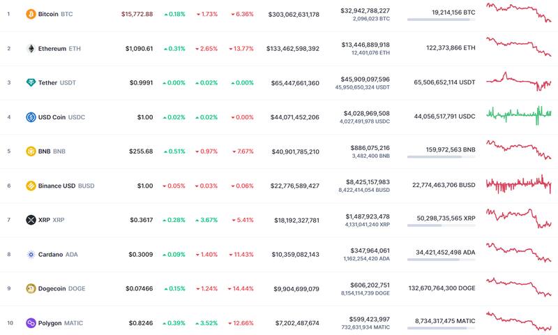 Según la información de CoinMarketCap, la cotización de BTC bajó un 1,7% para mantener el precio levemente por arriba de losu$s 15.700. Por su parte, Ethereum (ETH) tuvo un rendimiento similar al registrar una caída del 2,6% en las últimas 24 horas que deja su precio en el rango de los u$s 1090.