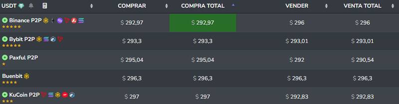 Según el portal especializado CriptoYa.com, esta cotización del dólar se encuentra en $ 297 promedio actualmente, lo que la pone unos $ 5 arriba del blue según los datos de hoy. En concreto, el precio varía de la siguiente manera según el exchange: