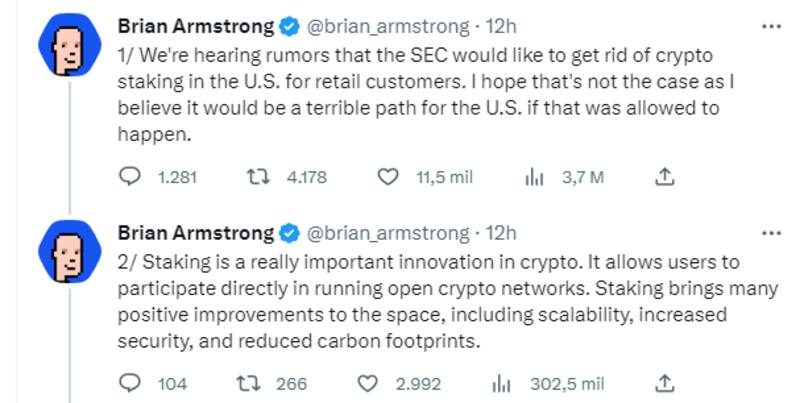 Armstrong criticó que las regulaciones son demasiado restrictivas y sofocarán la capacidad de empresas como Coinbase para ofrecer servicios de staking a sus clientes.