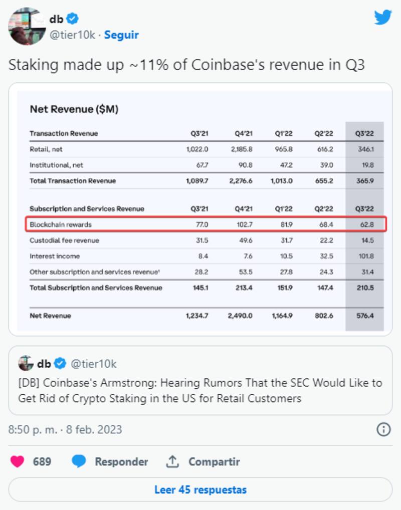 El mercado de staking a finales de 2022 llegaba a más de u$s 40.000 millones. Es por esto que los rumores asustan a Coinbase: el sistema de staking representó más del 10% de los ingresos de Coinbase el año pasado.