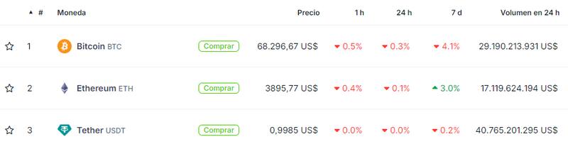El acontecimiento más significativo tiene que ver con la caída de Bitcoin (BTC) hasta los u$s 68.000; lo que representa una baja sustancial después de los u$s 70.000 que alcanzó ayer. Ethereum (ETH) no se quedó atrás y también experimentó recortes.