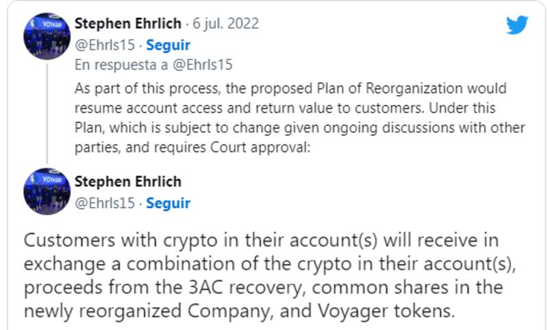 Voyager afirmó oficialmente que los clientes pueden esperar recibir el 35.72% de sus reclamaciones inicialmente, ya sea en cripto a través de la aplicación Voyager o en efectivo después de 30 días. Según Voyager, tenía u$s 1,330 millones en activos para recuperación a 8 de mayo, de los cuales u$s 629.8 millones estaban disponibles para recuperación inicial, sobre reclamaciones de u$s 1,800 millones, según informó Cointelegraph.