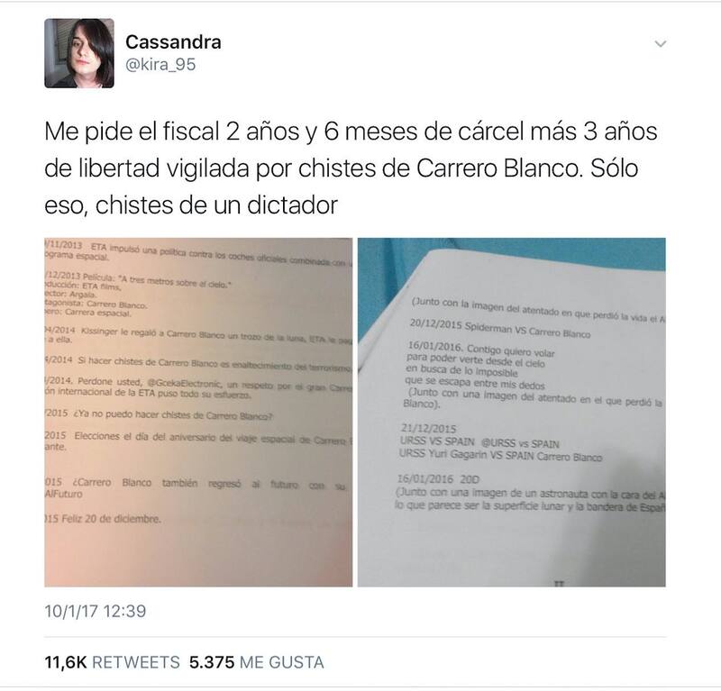 "Kissinger le regaló a Carrero Blanco un trozo de la luna, ETA le pagó el viaje a ella", "ETA impulsó una política contra los coches oficiales combinada con un programa espacial", "Película: A tres metros sobre el cielo. Producción: ETA films. Director: Argala. Protagonista: Carrero Blanco. Género: Carrera espacial". Lo que parecen comentarios humorísticos en marcado tono de humor negro, le costarán un año de cárcel a una tuitera del viejo continente conocida como Cassandra. En un fallo inédito, la Audiencia Nacional condeno a la tuitera a un año de prisión por delito de humillación a las víctimas del terrorismo. El tribunal considera que sus comentarios constituyen "desprecio, deshonra, descrédito, burla y afrenta" a personas que han sufrido "el zarpazo del terrorismo", y supone una actitud irrespetuosa y humillante.