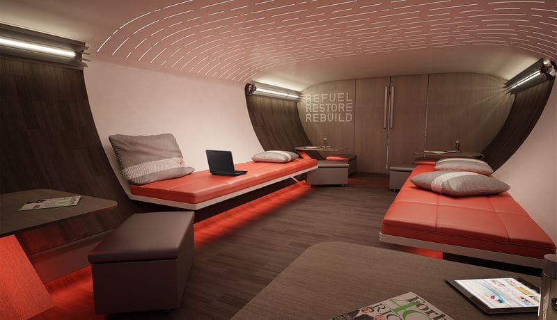 Entre otras adaptaciones, esta cabina presenta asientos reclinables en 180° adaptados para personas que superan los 2 metros de altura, para que resulten confortables para jugadores de básquet, vóley o rugby. Estas butacas, además, están aisladas en cápsulas transparentes y se ubican en espacios individuales ambientados con una luz tenue, que permite al pasajero descansar sin ser perturbado por el entorno.