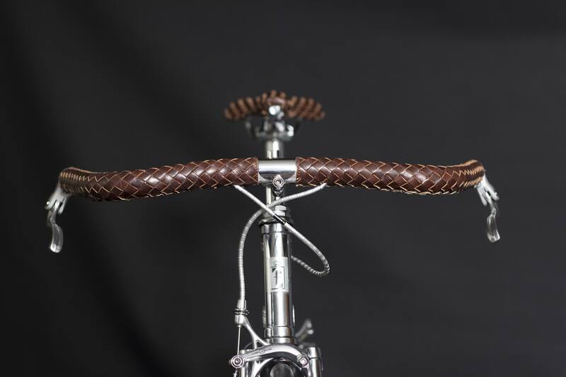 está hecho de tubos de acero cromado, mientras que el asiento y el manubrio están cubiertos de cuero.
