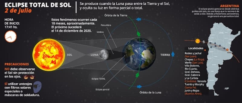 El próximo martes 2 de julio se podrá divisar en distintos lugares de todo el país un eclipse solar durante casi dos horas como fenómeno pero la oscuridad durara solo dos minutos.