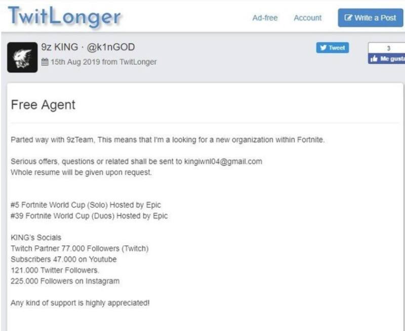 “Me separo de 9zTeam, lo que significa que estoy buscando una nueva organización dentro del Fortnite. Las ofertas o preguntas relacionadas se pueden enviar a mi mail , remarcó en un comunicado.