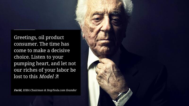 En el sitio web se replica los sobrecogedores testimonios de profesionales del petróleo ante el crecimiento imparable de Tesla, su conducción autónoma, su rango cada vez mayor de autonomía. Los Asociación de Barones del Petróleo quieren que la comunidad los ayude con la recaudación de 1.999.999.999 millones de dólares para poder comprar una isla perdida y planificar las decisiones que conducirá a la recuperación del predominio del petróleo en la automoción. De momento, llevan 11 dólares.