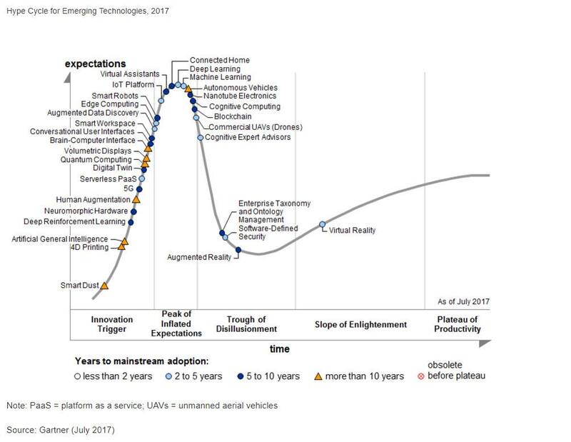 La versión 2017 del estudio de la consultora Gartner sobre los ciclos de sobreexpectación (hype cycles) de tecnologías emergentes ofrece una descripción gráfica de la madurez y la adopción de tecnologías y aplicaciones, y de cómo son potenciales nuevas oportunidades de negocio.