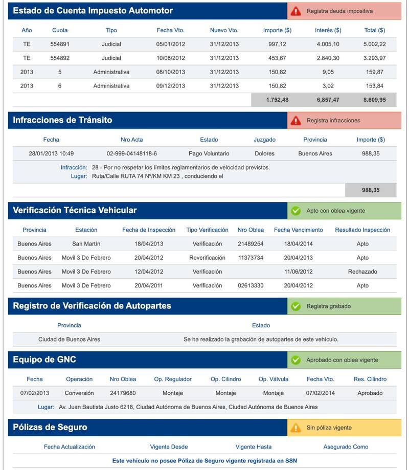 El reporte incluye datos como si el vehículo es de primera mano, si fue utilizado como taxi o remis, así como también una descripción completa de él (la marca, el modelo, el año, etc.), su situación impositiva, si posee infracciones de tránsito registradas y póliza de seguro vigente. Además, el estado de GNC, revisiones técnicas, gravado de autopartes, posibles defectos de fábrica (recalls), ficha técnica, estadísticas históricas del vehículo, precios de referencia, etc.