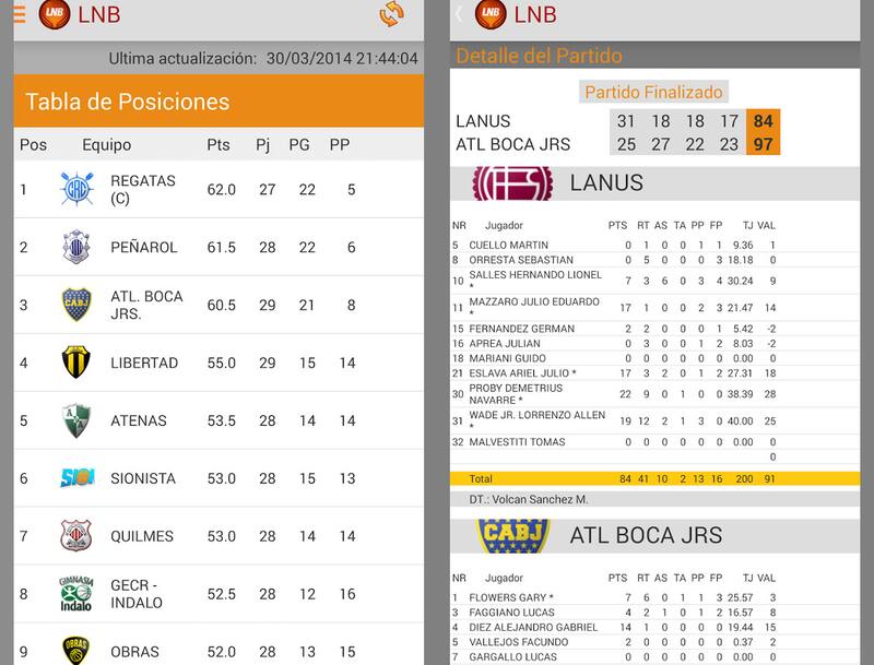 Pantalla. Así se ve la tabla de posiciones y las estadísticas de un partido en la aplicación LNB.