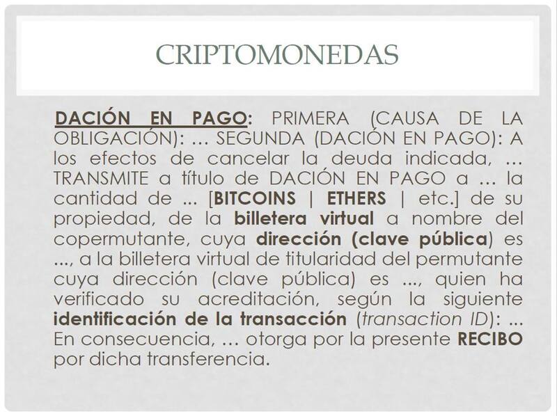 "Se puede hacer en blanco, sin problemas", refrenda Nicolás Soligo Schuler, escribano, asesor de presidencia de la Cámara Inmobiliaria Argentina. "Si el contrato no lo prevé, es conveniente hacer un complemento, una modificación, donde se reformula la obligación del locatario y se plantea la transferencia de criptomonedas como dación en pago", detalla.