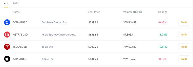 Por otro lado, la tokenización de acciones incrementa la liquidez y alcanza a más inversiones dentro del mercado. Por esta razón, Tesla, Apple, Coinbase y MicroStrategy comenzaron a vender acciones tokenizadas negociables y ya es posible acceder a través la plataforma Binance. A diferencia de una compra de acción tradicional, comprar un token es como comprar una criptomoneda de la empresa.