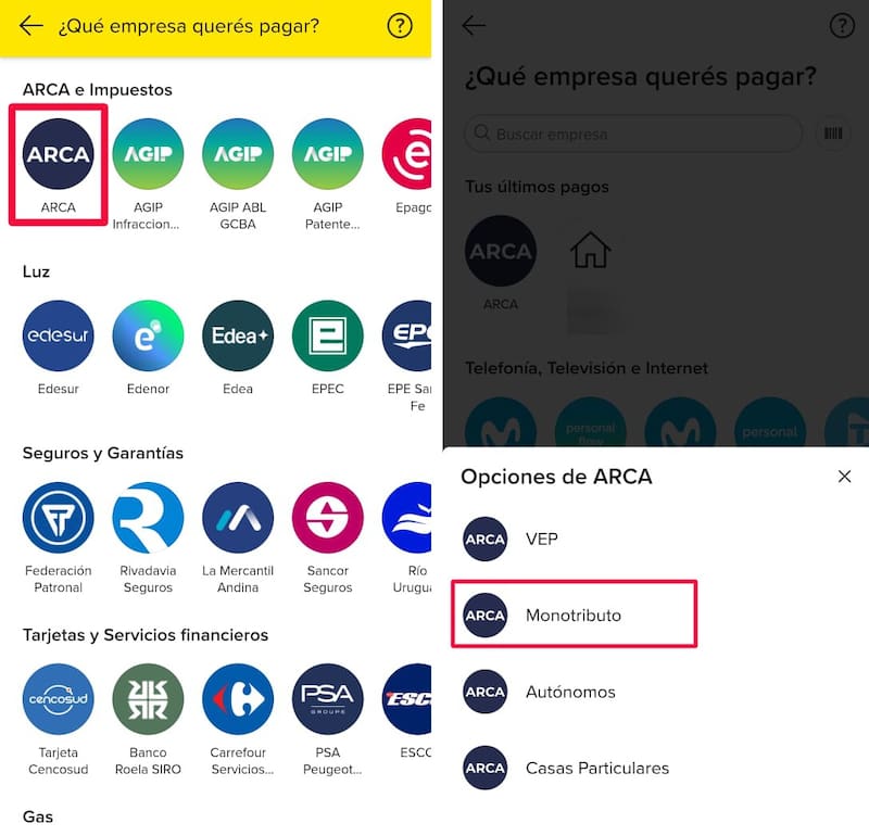 - Entre los servicios y empresas que aparecen, seleccionar “ARCA”.