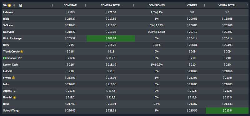 Según la plataforma Criptoya, que recopila información sobre la cotización de las criptomonedas en tiempo real en las principales casas de cambio digitales, DAI, uno de los principales dólares digitales, tiene un valor de compra de $ 209,97 y $ 213,8 para la venta.El valor más alto alcanza los $ 228 para la compra.