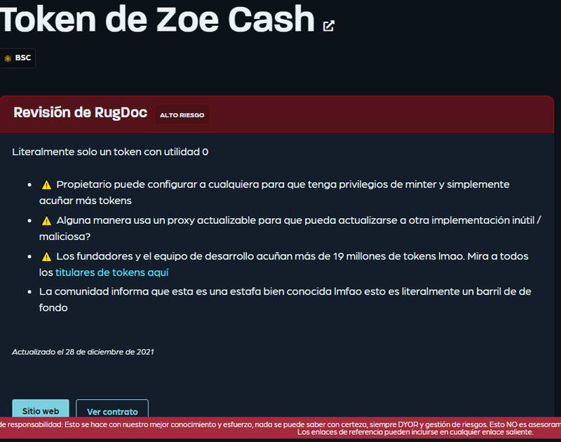 En este contexto, Rug Doc, un sitio que se dedica específicamente a analizar la seguridad de los proyectos criptográficos para garantizar la seguridad de millones de inversores, también emitió un alerta a toda la comunidad sobre Zoe Cash y la consideró una cripto de "alto riesgo".