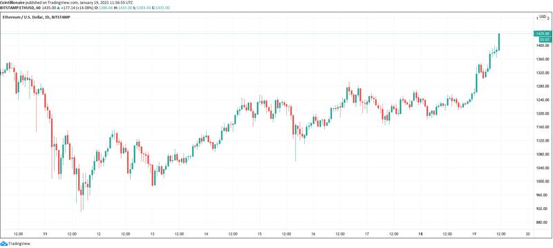 Los datos de Cointelegraph Markets y TradingView mostraron que el par ETH/USD superó su récord actual durante las operaciones de trading del martes, pasando $1,428 en Bitstamp.