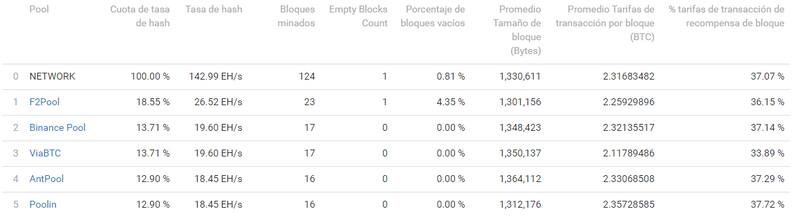 Finalmente, la información de quienes participan de la minería de la red Blockchain de Bitcoin es (casi) toda pública. Según datos del sitio BTC, la granja minera F2Pool tiene el 18.33% de la cuota total de hash. El segundo y tercer puesto lo ocupan Binance Pool (14.17%) y ViaBTC (13.33%).