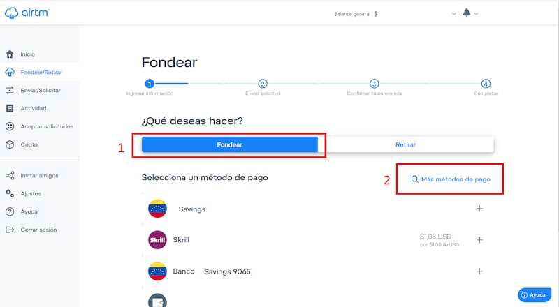 Para ingresar dinero, hay que ir a la plataforma Airtm y seleccionar "Fondear". Luego, ingresar a "Más métodos de pago", "Monederos digitales" y, finalmente, hacer clic en "PayPal". A continuación, hay que escribir la cantidad de dólares y automáticamente la aplicación reconvierte a AirUSD, la criptomoneda oficial.