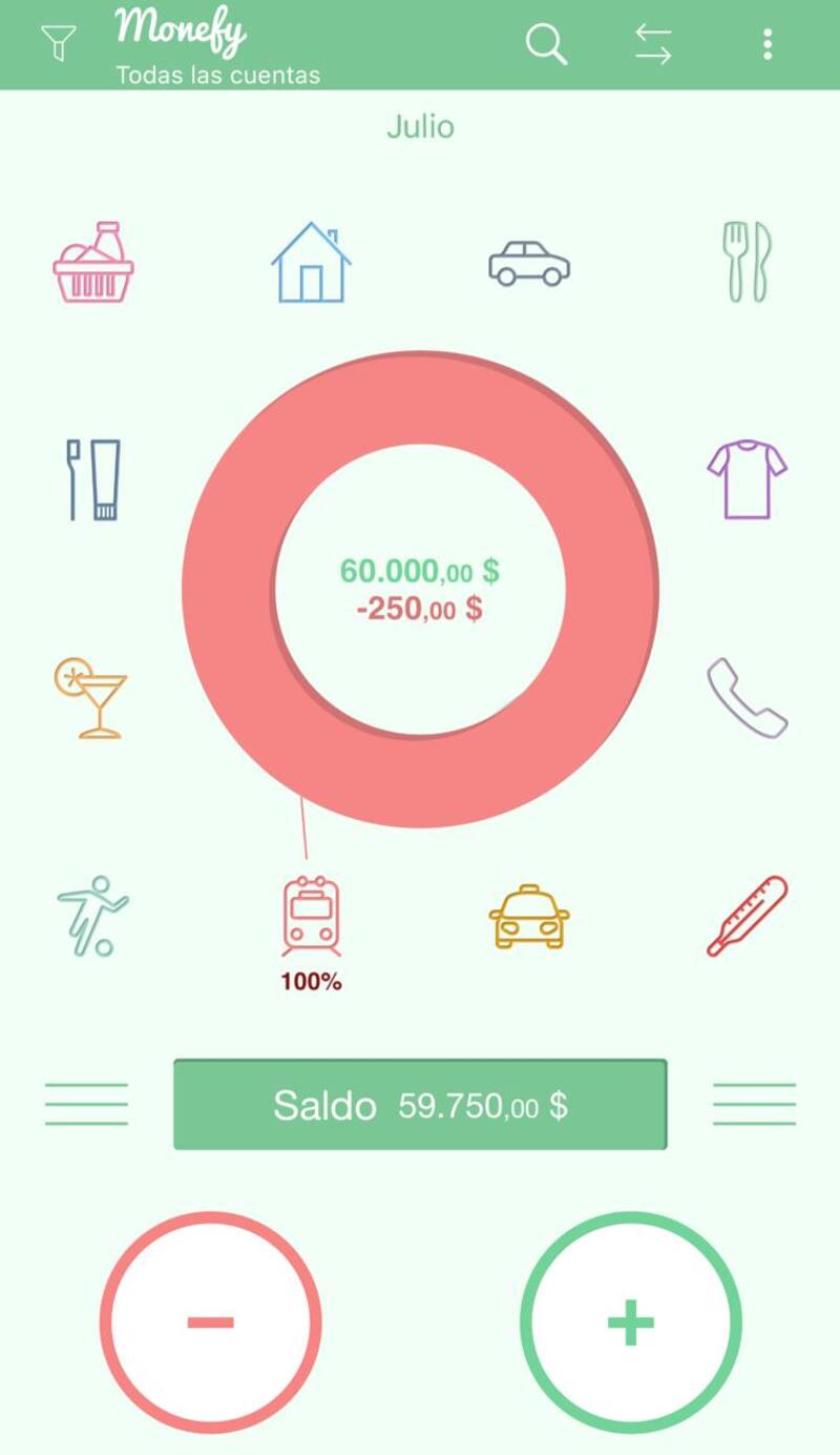 Como en la gran mayoría de las apps, también va mostrando el saldo disponible y se puede elegir el intervalo: día, semana, mes o año.