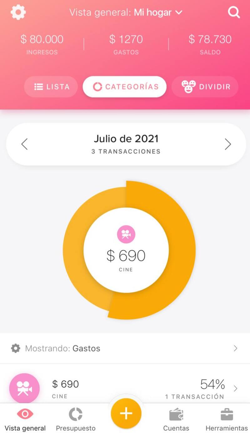 No es de las más claras para manejar, pero sí suma buenas funcionalidades como agregar notas y fotos a cada gasto, muy útil si necesitamos guardar tickets o comprobantes. Y, además, permite calendarizar algunos gastos para que se agreguen de forma automática: por ejemplo, esta es un plus muy bueno para sumar de lunes a viernes los boletos de colectivo que tomamos para ir a trabajar, y las expensas una vez al mes.