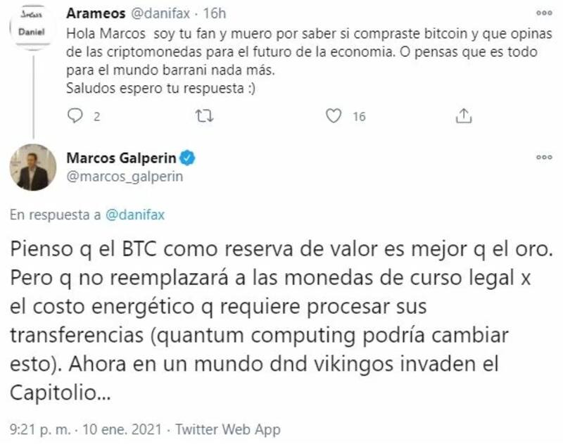Además, el empresario argentino considera que el Bitcoin es una mejor reserva de valor que el oro: "Pienso que el Bitcoin como reserva de valor es mejor que el oro. Pero no reemplazará a las monedas de curso legal por el costo energético que requiere procesar sus transferencias. La computación cuántica podría cambiarlo", dijo en una oportunidad Galperin.