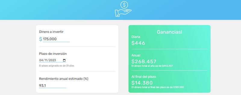 Si invertís $ 175.000, obtendrás una ganancia de $14.380 por mes. Al invertir $ 175.000 en el plazo de un mes, tendrás una ganancia diaria de $ 446. Y al cabo de un año, tu ganancia será de $ 268.457.