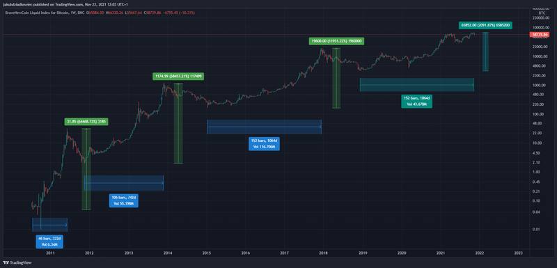Según un análisis, publicado por BeInCrypto, al analizar los ciclos de Bitcoin se ve que todavía falta una "vuelta más" en términos de ciclos alcistas. Medido desde el fondo absoluto hasta el pico absoluto de un ciclo dado y teniendo en cuenta el llamado ciclo de génesis (ciclo 1), la mayoría de los analistas coinciden en que la historia de Bitcoin hasta ahora consta de cuatro ciclos. Cada uno se caracteriza por una cierta duración (expresada en semanas, azul) y un máximo retorno de la inversión (ROI, expresado en porcentaje, verde).