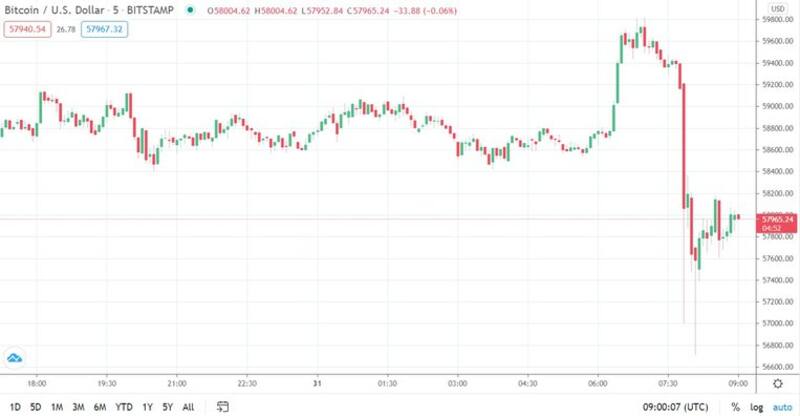 En las últimas 24 horas, el precio del Bitcoin (BTC) se posicionó en US$ 59.800 y luego bajó a US$ 57.000. Según datos del sitio Coin Monitor, en la Argentina un BTC vale $8.390.000.