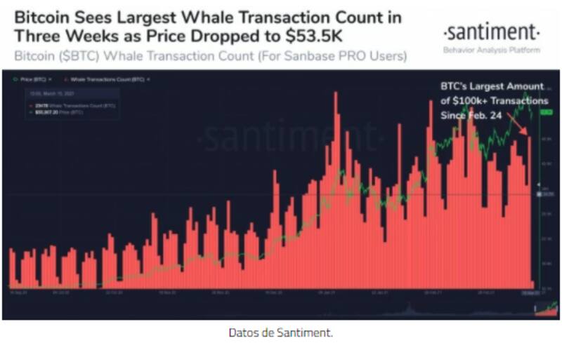Finalmente. las ballenas-actores que controlan una parte suficientemente grande de un activo- también influyen en el precio del BTC. Según la herramienta de análisis financiero en línea Santiment, cada ballena realizó 24.000 transacciones por un valor de US$ 100.000 en las últimas tres semanas. Este movimiento de dinero está relacionado con la corrección del precio del Bitcoin.