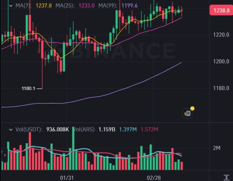 El dólar cripto USDT cotiza este viernes a $ 1.238,8 en el popular exchange Binance, a las 12 hs.